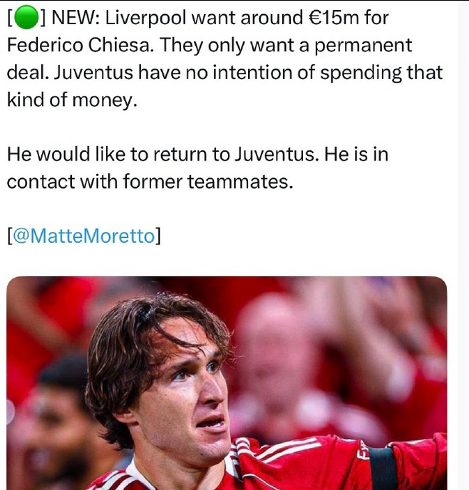 尤文图斯希望租借基耶萨,但利物浦不太可能在本月批准这位意大利前锋转会,想要做成需要有一份重磅转会报价,也需要能够招募一位合适的替代者。